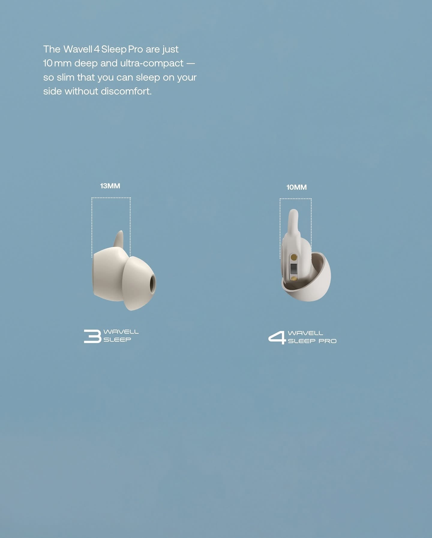 Wavell 4 Sleep Pro er ultrakompakte og kun 10 mm dybe, designet til at forsvinde i selv de mindste ører. Det komfortable og kompakte design betyder at du kan lægge dig på puden uden gener. De er ideelle til dig, der foretrækker at sove på siden.